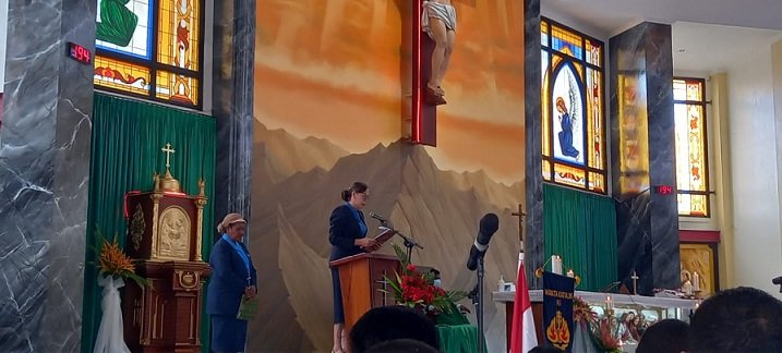 Theresia Tekege Agapa, Ketua DPC WKRI Santa Sisilia membacakan sambutan.