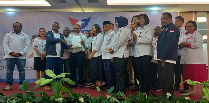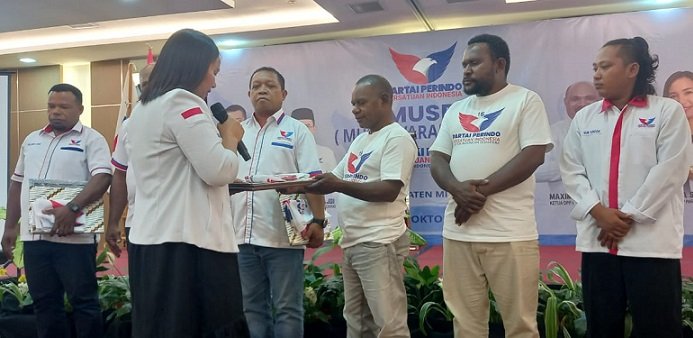 Otopianus P. Tebai, Ketua DPW Perindo Papua Tengah menyerahkan SK Pelantikan kepada Maximus Tipagau, Ketua DPD Perindo Mimika disaksikan para pengurus dan fungsionaris Perindo.