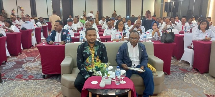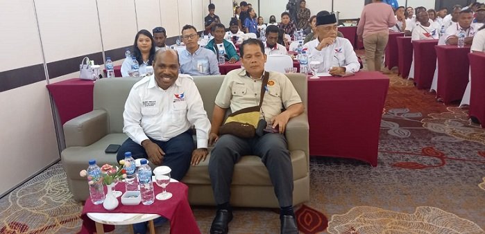 Septinus Timang, Staf Ahli Bupati Mimika Bidang Politik, Hukum dan Ham didampingi Otopianus P. Tebai, Ketua DPW Perindo Papua Tengah mengikuti Musda.