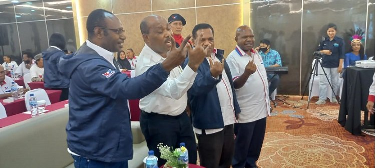Otopianus P. Tebai, Ketua DPW Perindo Papua Tengah, Maximus Tipagau, Ketua DPD Perindo Mimika bersama dua anggota DPRD Mimika asal Perindo menunjukan salam Perindo.