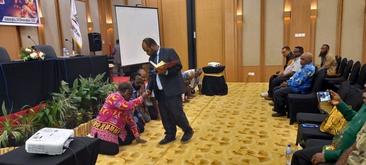 Sekretaris Sinode Gereja Kingmi Papua, Pendeta Dominikus Pigai, S.Th melantik Panitia Pembangunan Kantor Perwakilan Sinode Kingmi Papua Tengah, Jumat 15 Desember 2023.