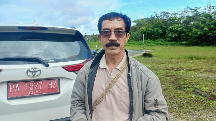 Mathius Sedan, Kepala Distrik Wania saat tiba Kampung Mandiri Jaya untuk menyerahkan bantuan PMT.