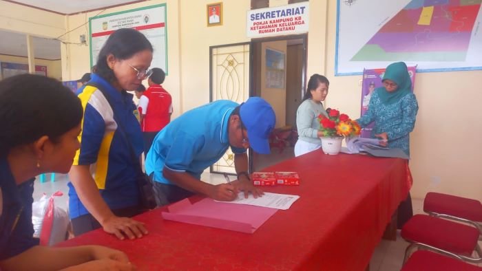 Musdahlifa, Lurah Kamoro Jaya saat melakuan tanda tangan setelah menerima Pemberian Makanan Tambahan (PMT).