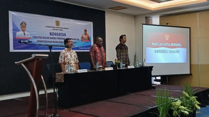 Yakobus Karet, Staf Ahli Bidang Pemerintahan Politik dan Hukum Setda Mimika, Mathius Sedan, Kadistrik Wania, Wardan, Tenaga Ahli Perencanaan Wilayah dan Kota menyanyikan lagu Indonesia Raya.