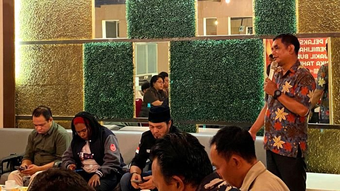 Roni Toisuta, Sekretaris KPU Mimika selaku Mc ketika memandu kegiatan FGD.