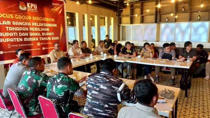 FGD yang berlangsung di salah satu hotel di Timika, Jumat 24 Agustus 2024 dihadiri sejumlah stakeholder di Mimika. Diantaranya, Bawaslu, TNI-Polri, Kesbangpol, RSUD Mimika, dan Bappeda.