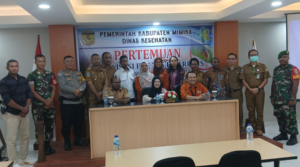 Obeth Tekege, Kabid P2P Dinkes Mimika, Kamal, Kasie P2P Mimika foto bersama Lurah Koperapoka Frengky Max, Babinsa Kampung Limau Asri Barat dan Timur, Iptu I Made Aribawa, Kanit Binmas Polsek Miru dan Kepala Puskesmas Limau Asri dan Puskesmas Timika usai acara pembukaan.