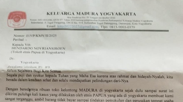 Demikian surat yang dilayangkan keluarga Madura tertanggal 7 Februari 2025 ditandatangani RB. Jugil Adiningrat, SH, Ketua Keluarga Madura Yogyakarta dan M. Fahri Hasyim, SH, MH.