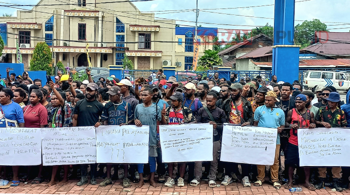TIMIKA, Koranpapua.id- Ratusan warga melakukan unjuk rasa di depan kantor Dinas Perhubungan Kabupaten Mimika, Provinsi Papua Tengah di Jalan C Heatubun, Selasa 29 April 2025.