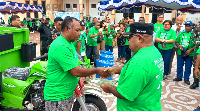 Penyerahan simbolis motor sampah roda tiga bantuan dari DLH mimika kepada 13 kelurahan, dari Emanuel Kemong, Wakil Bupati Mimika kepada salah satu penerima.