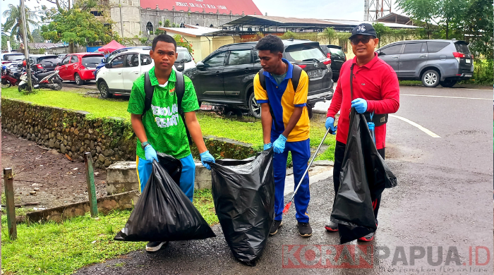 Nampak beberapa orang melakukan bersih bersih sampah di halaman Gedung Eme Neme Yauware. (***)