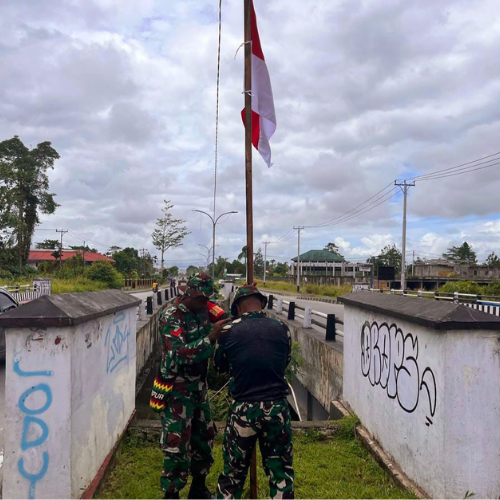 Puluhan anggota TNI yang dipimpin Danramil 1710-06/Agimuga, Lettu Inf A.A. Rumayom, terlihat antusias memasang bendera satu per satu di sepanjang jalan dalam kota Timika.