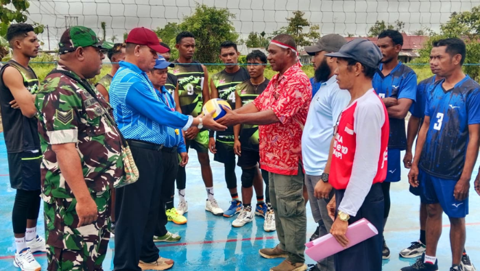 Kepala Kampung Nawaripi, Norman Ditubun menyerahkan bola kepada wasit yang memimpin pertandingan voli putra. (foto:ist/koranpapua.id)