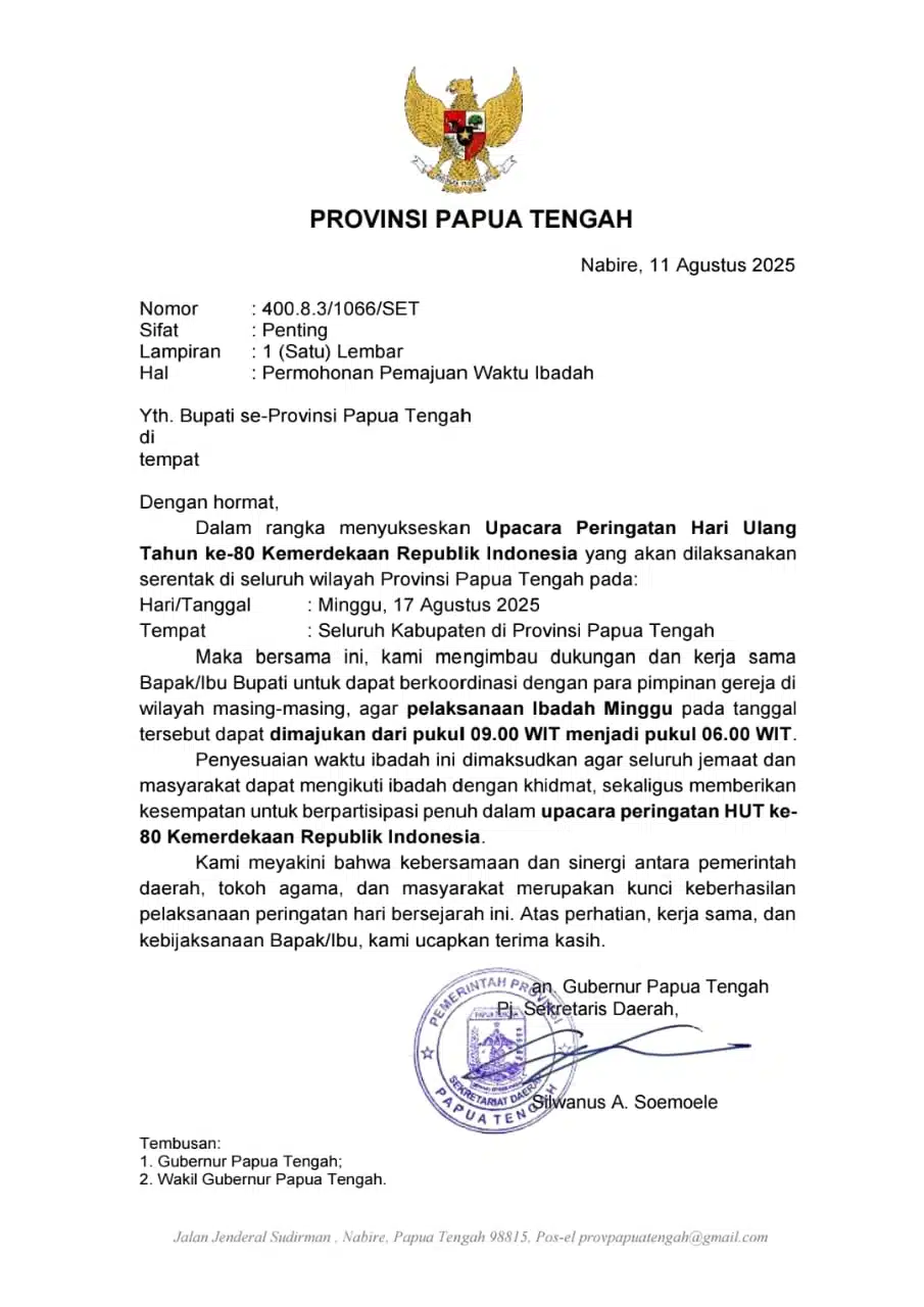 “Maka bersama ini, kami mengimbau dukungan dan kerjasama bapak/ibu Bupati untuk dapat berkoordinasi dengan para pimpinan gereja di wilayah masing-masing agar pelaksanaan Minggu pada tanggal tersebut dapat dimajukan dari pukul 09.00 WIT menjadi pukul 06.00 WIT,” tulis Silwanus A. Soemoele, Pj Sekda Papua Tengah dalam surat tersebut.
