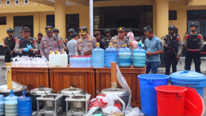 Selain ketiga tersangka MK, IA, dan AK, polisi juga mengamankan barang bukti berupa 110 liter Miras siap edar, 225 liter bahan baku, serta peralatan produksi.