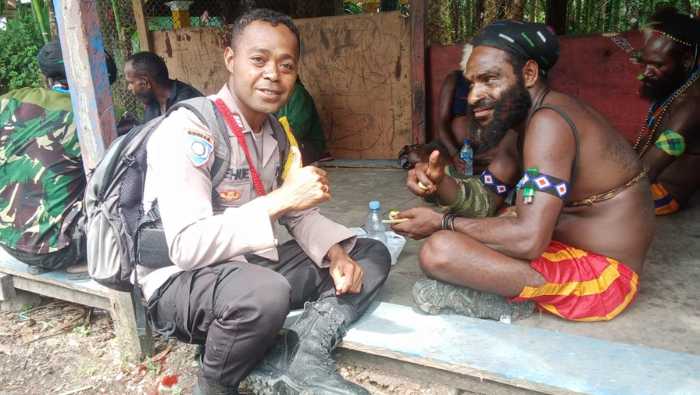Dalam kesempatan tersebut, Brigpol Nixon Mehue melakukan dialog santai bersama sejumlah warga Suku Damal yang tengah berkumpul di halaman rumah sambil menikmati kopi.