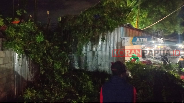 Sementara itu, kejadian kedua tidak jauh dari lokasi pertama. Sebuah pohon tumbang menimpa kios milik Ibu Sutriani yang berada di samping Gedung Eme Neme Yauware.