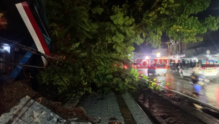 Dua Pohon Tumbang di Jalan Budi Utomo Robohkan Halte dan Timpah Kios Warga