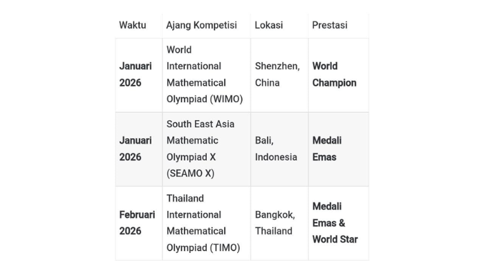 Ini setelah dirinya menyapu bersih berbagai penghargaan bergengsi di ajang olimpiade matematika internasional awal tahun 2026.